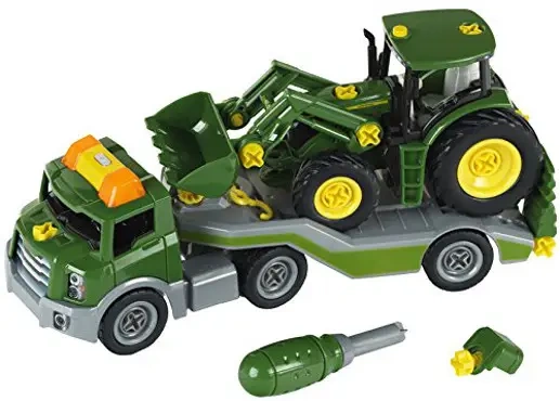 Zestaw konstrukcyjny 3908 zawiera traktor John Deere z ładowaczem przednim na ciężarowej lawecie. Każdy z pojazdów jest przystosowany do rozkręcania i skręcania go przez dziecko za pomocą dołączonego do zestawu śrubokrętu. Laweta dla uatrakcyjnienia zabawy została wyposażona w moduł świetlno-dźwiękowy. Oba pojazdy posiadają gumowe opony i są bardzo solidnie wykonane, co zapewnia godziny świetnej zabawy. Kompletny zestaw zawiera traktor John Deere z ładowaczem przednim / wymiary ciągnika z ładowaczem: 24 x 12 x 9,5 cm, a także lawetę z modułem świetlno-dźwiękowym o długości ok : 40 cm. Zestaw wymaga zastosowania baterii, których brak w zestawie. Jest to zabawka łącząca w sobie kilka istotnych cech : majsterkowanie, kreatywność oraz klasyczną zabawę autami. Wszystkie elementy wykonane są tak precyzyjnie, że nawet 3-letnie dzieci są w stanie poradzić sobie z odkręcaniem i wkręcaniem śrub. Dzięki posiadanej licencji John Deere i staranności wykonania, produkty odwzorowane będą w wysokim stopniu z realnymi pojazdami. Dzięki wielu możliwościom złożenia tego zestawu mali fani marki John Deere mogą popuścić wodze wyobraźni. Dzięki zabawce konstrukcyjnej dzieci ćwiczą swoją sprawność motoryczną i koordynację oko-ręka, a dzięki wielu możliwym kombinacjom także wyobraźnię i kreatywność.