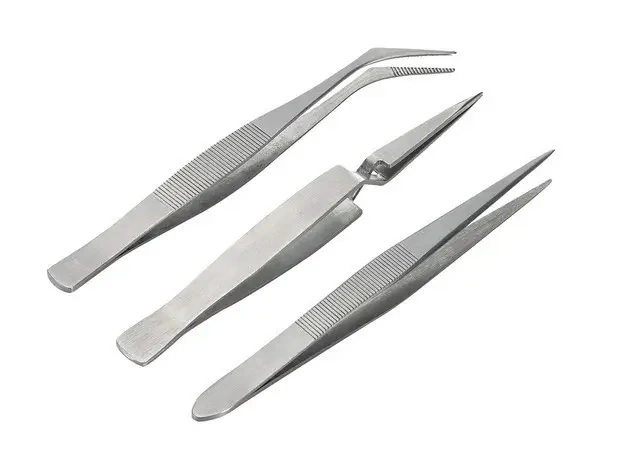 Zestaw trzech pęset modelarskich.