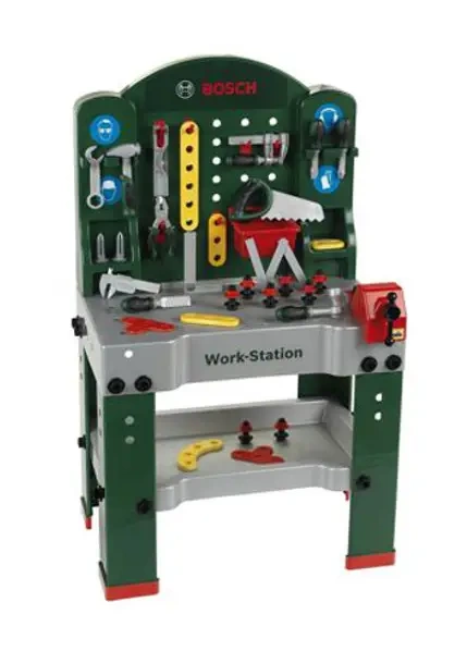 Warsztat marki Klein pochodzi z serii zabawek Bosch mini powstałej na licencji firmy Bosch, dlatego też narzędzia wchodzące w jego skład są wiernymi kopiami faktycznie istniejących narzędzi tej marki. W zestawie zapakowanym w duży zielony karton Klein, znajdziemy 44 elementy konstrukcyjne i narzędzia do zabawy. Głównym elementem tego zestawu jest z pewnością szaro-zielony stół warsztatowy ze ścianą z czerwonymi haczykami i jednym pojemniczkiem na drobne akcesoria. Narzędzia będące częścią tego warsztatu to czerwone imadło, młotek, kombinerki, piła, pilnik, klucz nasadowy, dwa śrubokręty i ścisk stolarski. Zabawki te mają ciemno-zielone rączki, a ich wygodny uchwyt ma dodatkowo czarną profilowaną powierzchnię z logo Klein ułatwiającą utrzymanie narzędzia w dziecięcych dłoniach. Dodatkowo przy warsztacie znajdziemy jeszcze srebrny klucz płaski, poziomicę, kątownik, miarkę i suwmiarkę także wiele innych drobnych elementów, jak śrubki, nakrętki, dwa gwoździe czy inne części konstrukcyjne do kreatywnej zabawy. W blacie warsztatu znajdują się kilka otworów do wbijania dołączonych (plastikowych) gwoździ i wkręcania śrub. Wszystkie elementy zestawu są wykonane z plastiku, pozbawione ostrych krawędzi i całkowicie bezpieczne dla dziecka. Zestaw został stworzony z dbałością o szczegóły i detale z wysokiej jakość materiałów, przez co wiernie naśladuje prawdziwe narzędzia i będzie służyć dzieciom przez długi czas. Dzięki warsztatowi dzieci w bezpieczny sposób będą mogły wcielić się w rolę majsterkowicza, zapewniając sobie realistyczne doświadczenie korzystania z wszystkich jego narzędzi. Dzieci uwielbiają naśladować rodziców wykonujących codzienne czynności domowe lub w nich uczestniczyć, jednak nie zawsze jest to możliwe ze względów bezpieczeństwa, a dzięki temu całkowicie bezpiecznemu dla dzieci, zabawkowemu warsztatowi z narzędziami każdy mały majsterkowicz może bezpiecznie robić to, co jego opiekunowie.