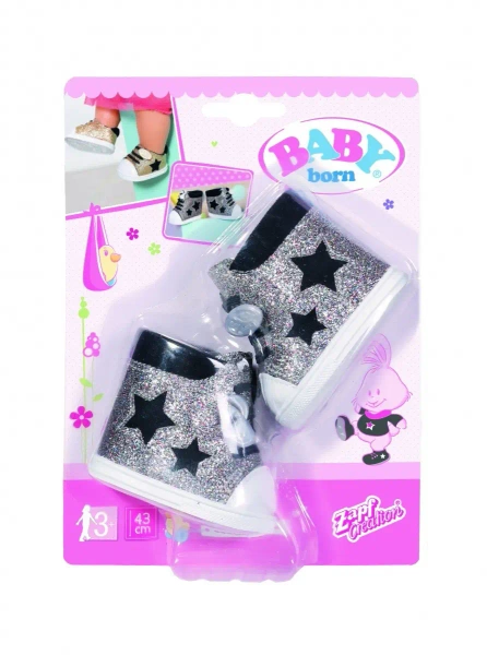 Te niezwykłe, błyszczące tenisówki zapewnią niesamowitą zabawę dla Twojej lalki BABY born(R). Połyskujące obuwie w stylu glamour urzeka czarnymi detalami, które idealnie wpasowują się w sportowe, codzienne, a nawet eleganckie stylizacje Twojej ulubionej lalki.