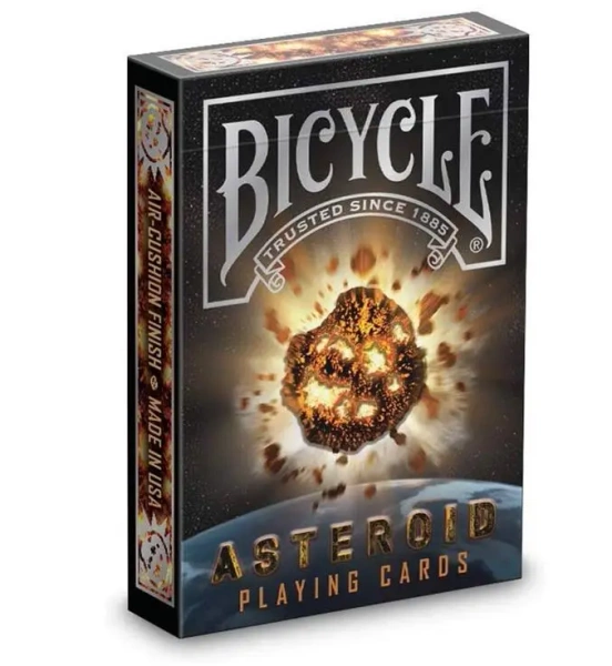 Bicycle Asteroid talię wyróżniają niebywale żywe kolory charakterystyczne dla naszego układ słonecznego. Ponieważ we wszechświecie nie ma dwóch takich samych asteroid to każda karta tej talii Cię zaskoczy, jest unikalna.