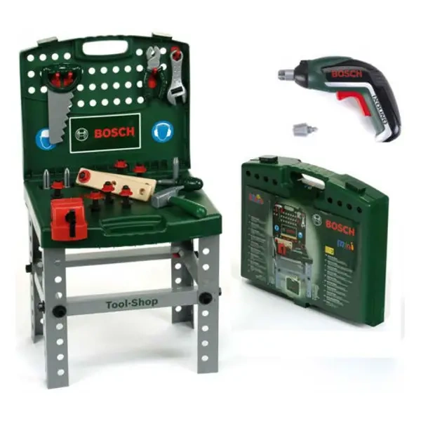 Warsztat marki Klein pochodzi z serii zabawek Bosch mini powstałej na licencji firmy Bosch, dlatego też narzędzia wchodzące w jego skład są wiernymi kopiami faktycznie istniejących narzędzi tej marki. W zestawie zapakowanym w ciemno zieloną walizkę z wygodną rączką i dwoma zamkami zabezpieczającymi przed niechcianym otwarciem, znajdziemy 25 elementów konstrukcyjnych i narzędzi do zabawy. Po otwarciu w komplecie jest zestaw czterech srebrnych i stabilnych nóg, na których układa się otwartą walizkę, która stanowi blat i jednocześnie tylną ścianę warsztatu. Walizka jest zarówno opakowaniem transportowym tego warsztatu, jak również po otwarciu i złożeniu stanowi kompletny warsztat z narzędziami i wkrętarką Ixiolino II do zabawy. Narzędzia będące częścią tego warsztatu to czerwone imadło, młotek, kombinerki, piła, śrubokręt z dwiema końcówkami i klucz francuski. Zabawki te mają ciemno-zielone rączki, a ich wygodny uchwyt ma dodatkowo czarną profilowaną powierzchnię z logo Klein ułatwiającą utrzymanie narzędzia w dziecięcych dłoniach. Ponadto w zestawie znajduje się bezprzewodowa wkrętarka Ixiolino II. Wkrętarka jest solidnie wykonana z dużą dbałością o szczegóły, ma dwie wymienne końcówki śrubokręta, przez co wiernie naśladuje prawdziwe urządzenie. Zabawka jak prawdziwa ma uchwyt z gumową powierzchnią ułatwiającą utrzymanie zabawki, ma możliwość przełączenia za pomocą czerwonego przesuwaka obrotu końcówki w prawo i w lewo, a także diodę podświetlającą miejsce wkręcania, zamieszczoną nad bitem. Wszystkie elementy zestawu są wykonane z plastiku, pozbawione ostrych krawędzi i całkowicie bezpieczne dla dziecka. Zestaw został stworzony z dbałością o szczegóły i detale z wysokiej jakość materiałów, przez co wiernie naśladuje prawdziwe narzędzia i będzie służyć dzieciom przez długi czas. Dzięki warsztatowi walizkowemu dzieci w bezpieczny sposób będą mogły wcielić się w rolę majsterkowicza, zapewniając sobie realistyczne doświadczenie korzystania z wszystkich jego narzędzi, przy zachowaniu bardzo niewielkich rozmiarów transportowych złożonej zabawki. Dzieci uwielbiają naśladować rodziców wykonujących codzienne czynności domowe lub w nich uczestniczyć, jednak nie zawsze jest to możliwe ze względów bezpieczeństwa, a dzięki temu całkowicie bezpiecznemu dla dzieci, zabawkowemu warsztatowi walizkowemu z narzędziami każdy mały majsterkowicz może bezpiecznie robić to, co jego opiekunowie. Zabawka wymaga użycia baterii, które nie są zawarte w zestawie.