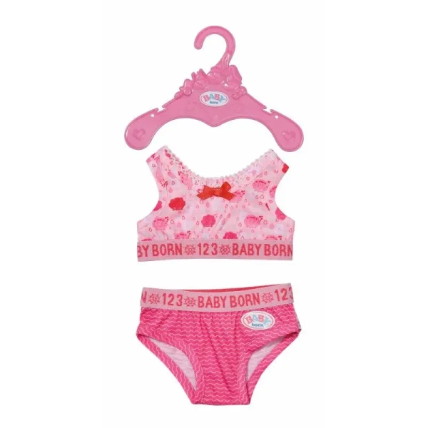 Wyjątkowo wygodna bielizna sprawia, że BABY born przepełnia radość. Na różowym topie znajduje się zabawny nadruk przedstawiający małża. Dopasowane różowe majteczki są ozdobione zygzakami nawiązującymi do morskich fal.