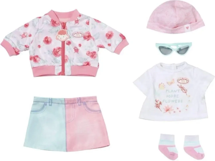 Świeży wiosenny strój Baby Annabell jest naprawdę fajny. Spódnica jeansowa ma dwa kolory. Na koszuli i kurtce nadrukowane są urocze kwiatowe wzory. Kiedy jest jeszcze trochę za zimno, Annabell nosi skarpetki, swobodną kurtkę typu bomber i modną czapkę. A jeśli słońce świeci zbyt mocno, zestaw zawiera również turkusowe okulary przeciwsłoneczne.