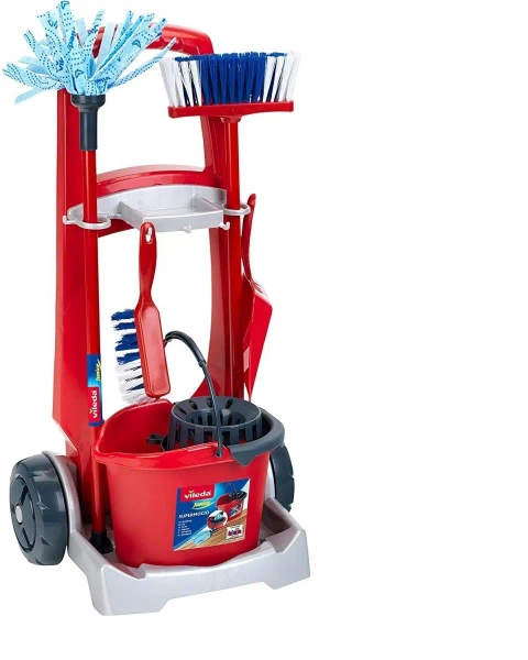 Wózek do sprzątania i odkurzacz powstał na licencji firmy Vileda, dlatego też zestaw jest wierną kopią prawdziwych urządzeń tej marki. Większy element zestawu stanowi czerwony-szary wózek z dużymi kołami oraz rączką do prowadzenia. Wózek jest wyposażony w różnego rodzaju akcesoria, dzięki którym dziecko może uczestniczyć w codziennym sprzątaniu lub naśladować rodziców podczas tej czynności. W zestawie znajduje się czerwone wiaderko z czarnym wyciskaczem mopa, szczotka oraz czerwona zmiotka z szufelką. Zestaw jest łatwy do złożenia, a wszystkie zawarte w nim akcesoria są mini-wersją prawdziwych akcesoriów do sprzątania marki Vileda, dzięki czemu dziecko może robić dokładnie to, co jego rodzice. Mniejszym elementem zestawu jest odkurzacz pionowy (3w1) w kolorze czerwonym z czarnymi elementami i szarą rurą. Rura odkurzacza w dolnej części ma zintegrowany i obracający się podczas kontaktu z podłożem roler w którym umieszczone są w zamknięciu małe plastikowe kulki imitujące wciąganie brudu. Odkurzacz posiada w swojej rączce przezroczysty nierozbieralny zbiorniczek, w którym po włączeniu poruszają się drobne elementy piankowego granulatu. Zabawka przez obracający się silniczek naśladuje także odgłos prawdziwego odkurzacza, dzięki czemu zabawa nim jest jeszcze bardziej realistyczna. Do wyboru po złożeniu mamy aż trzy wersje, gdzie odkurzacz może być używany jako odkurzacz podłogowy, odkurzacz ręczny lub odkurzacz ręczny z ssawką szczelinową. Zabawka posiada wygodny uchwyt, dopasowany rozmiarem do dziecięcych rączek, dlatego zabawa odkurzaczem Vileda jest komfortowa dla dzieci. Wózek do sprzątania z odkurzaczem Vileda to doskonały zestaw dla każdego dziecka, które uwielbia naśladować rodziców podczas sprzątania i z pewnością w krótkim czasie stanie się on ulubioną zabawką dziecka. Dla właściwego działania zabawka wymaga użycia baterii, które nie są dołączone do zestawu. Zabawka wymaga użycia baterii, które nie są zawarte w zestawie.