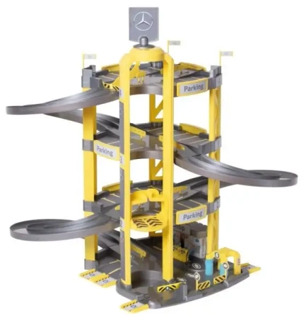 Parking wielopoziomowy posiada podwójną rampę zjazdową przygotowaną do wyścigów. Zabawka wyposażona jest w 2 tory na 2 małe samochody lub 1 pas zjazdowy dla 1 dużego samochodu. Parking wyposażony jest w windę, stację benzynową, myjnię samochodową i 2 małe samochody.
