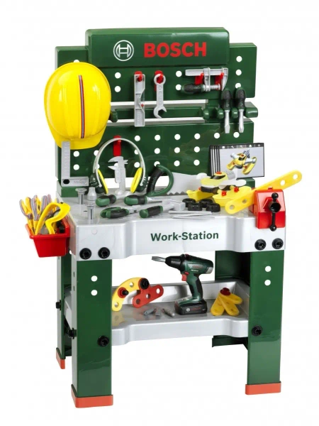 W pełni wyposażony stół warsztatowy dla dzieci jest produkowany w Niemczech na licencji Bosch. Blat oferuje liczne funkcje edukacyjne, imadło oraz praktyczne miejsca do przechowywania i schowek. Na tylnej ścianie ławki do majsterkowania oraz na półce pod blatem roboczym znalazło się miejsce na wysokiej jakości, 81-częściowe akcesoria, z których część można zawiesić na ścianie za pomocą praktycznych haczyków: elektryczna wkrętarka akumulatorowa dla dzieci, śrubokręt płaski i krzyżakowy, klucz, grzechotka, szczypce i pilnik, młotek, piła i skala, kwadrat, linijka i zacisk śrubowy. Dzieci uczą się umiejętnie posługiwać się śrubami, nakrętkami i elementami do skręcania w różnych rozmiarach i kształtach oraz zwracać uwagę na bezpieczeństwo dzięki zabawkowym hełmom i okularom ochronnym, fajnym nausznikom i rękawiczkom. Szczególną frajdę sprawia pojazd do samodzielnego montażu, który można skręcić i ponownie rozkręcić na stanowisku pracy.