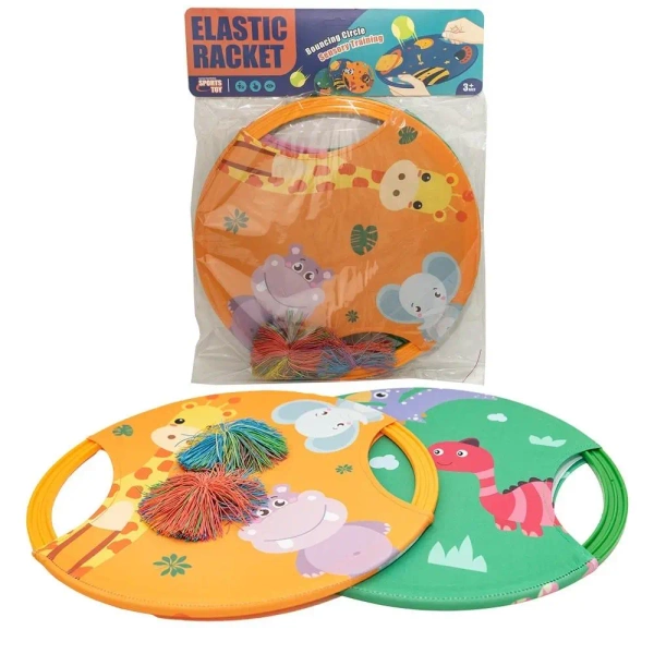 W skład zestawu wchodzą dwie obręcze oraz dwa elastyczne pompony do odbijania. Można odbijać samodzielnie ćwicząc koordynację ruchową lub grać w dwie osoby. Świetna propozycja do zabawy dla dzieci na zewnątrz. Średnica pomponów ok. 11 cm Średnica tarczy: 34 cm . Ilość elementów: 2 tarcze oraz 2 elastyczne pompony do odbijania. Kolor produktu: wielokolorowy.