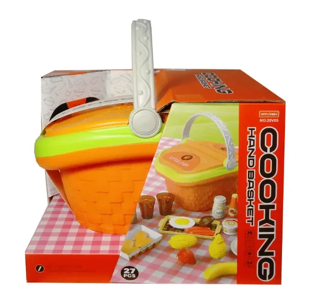 Koszyk piknikowy z akcesoriami. W zestawie m.in.: kosz, plastikowe owoce, warzywa, mięso, buteleczki z przyprawami, garnek, kuchenka, jedzenia. Łącznie 27 elementów. Zabawka dla dzieci od 3 lat. Produkt zapakowany w kartonowe opakowanie z okienkiem. Wymiary są wymiarami opakowania.