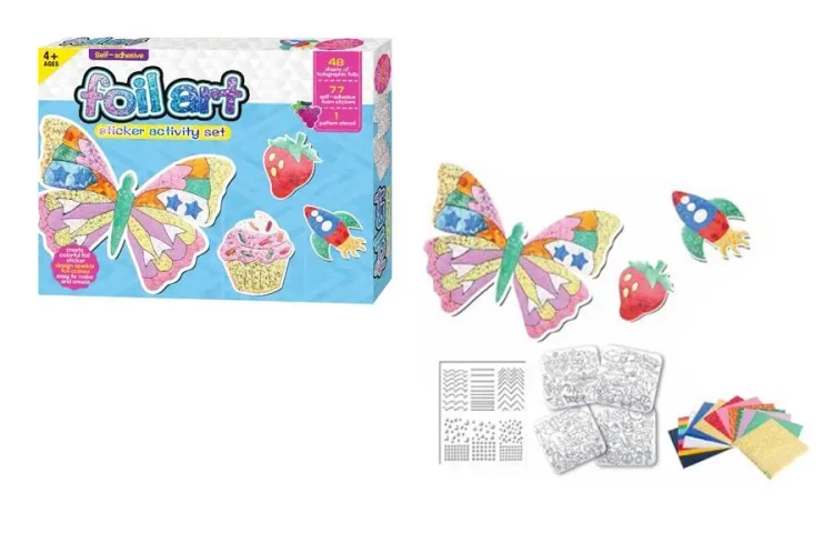 Zestaw kreatywny DIY do tworzenia dekoracji. Stwórz kolorową naklejkę foliową. Zabawka jest łatwa do wykonania i stworzenia naklejek. W zestawie znajduje się 48 arkuszy folii holograficznej, 77 samoprzylepnych naklejek, 1 wzornik. Dlatego żeby stworzyć swoje dekoracje starczy wyciągnąć naklejkę i zdjąć białe zabezpieczenie, dalej umieścić arkusz folii na powierzchni naklejki i dokładnie pocierać palcem, żeby folia została przyklejona do naklejki. Zabawka dla dzieci od 3 lat. Produkt zapakowany