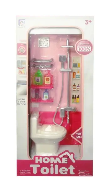Mebelki do łazienki z akcesoriami dla lalek. W zestawie znajduje się m.im.: otwierana toaleta, uchwyt na papier, prysznic, 2 półki na kosmetyki, 4 butelki z różnymi płynami, wieszaki na ręcznik. Zabawka dla dzieci od 3 lat. Produkt zapakowany w kartonowe opakowanie z przezroczystym okienkiem. Podane wymiary są wymiarami opakowania.