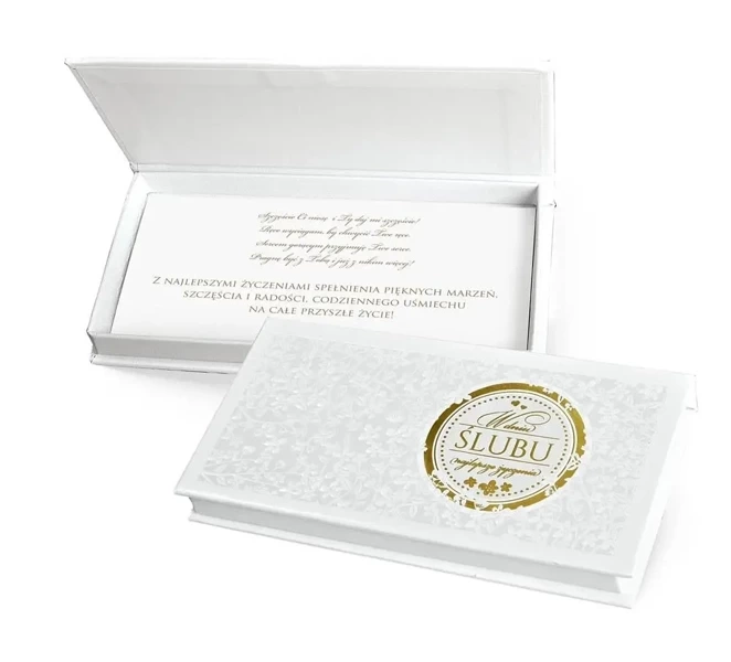 Pudełko jest eleganckim sposobem na podarowanie bliskiej osobie banknotu lub karty podarunkowej. Pudełko ozdobne jest uszlachetnione metalizowaną folią hot-stamp, co nadaje mu wyjątkowego charakteru. W zależności od wzoru, na pudełkach znajdują się dekoracje ze złotej, srebrnej lub perłowej folii. Dzięki wbudowanemu magnesikowi można je wielokrotnie zamykać i otwierać. To doskonały wybór na okazję, która wymaga gustownego i praktycznego opakowania prezentowego. Posiadają życzenia w środku.
