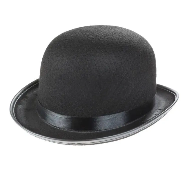 MELONIK czarny, gładki Obwód: 57 cm Melonik wykonany z czarnego przyjemnego w dotyku materiału, na dole zdobiony czarną wstążką. Usztywnione rondo kapelusza zabezpiecza przed nieefektownym opadaniem i pozwala na pełną swobodę.