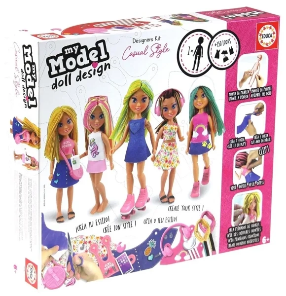 Twoja lalka, twój styl! Zostań projektantem i stylistą dzięki temu kreatywnemu zestawowi. Seria My Model (Lalka ubieranka) zawiera lalkę do złożenia, która ma ruchomą głowę, ramiona, łokcie, nadgarstki, biodra i kolana, mnóstwo modnych dodatków oraz kolorowe włosy! Najpierw złóż lalkę, gdy będzie już gotowa, czas na stylizację (ponad 150 możliwości)! Wytnij tkaninę według wzorów. Nie potrzeba igły i nici, wystarczy przypiąć ubrania do lalki. To bardzo proste! Stwórz różne fryzury, obcinając włosy i łącząc kolory! Gdy lalka jest już gotowa, można się nią bawić jak każdą inną. ZAWARTOŚĆ: lalka do złożenia tkanina z nadrukowanymi wzorami ponad 23 modne akcesoria klipsy do ubrań wełna do włosów dziurkacz instrukcja