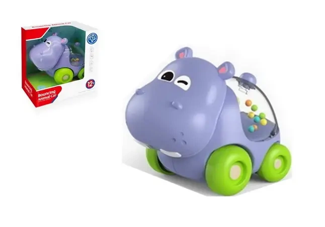 Zabawka pojazd w kształcie hipopotama dla młodszych dzieci. We wnętrzu zwierzątka znajdują się kolorowe kuleczki, które grzechoczą. Pojazd jest wykonany z wytrzymałego plastiku w żywych kolorach. Zabawka dla dzieci od 12 miesiąca życia. Produkt zapakowany w kartonowe opakowanie. Podane wymiary są wymiarami opakowania.