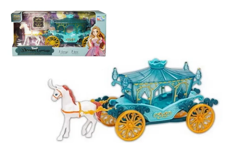 Zabawka kareta wraz z koniem dla dzieci. Kareta pozwoli każdej dziewczynce wcielić się w rolę księżniczki i wyruszyć na wielki bal na którym może spotka swojego księcia. Produkt w żywych kolorach. Produkt dla dzieci od 3 lat. Zabawka zapakowana w kartonowe opakowanie z okienkiem. Podane wymiary są wymiarami opakwoania.