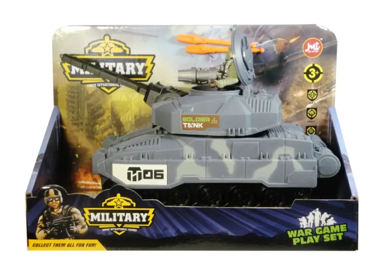 Plastikowy czołg dla dzieci. Urozmaici czas podczas zabaw militarnych. Zabawka obraca działem oraz armatą. Kiedy załaduje się działo pociskami - wystrzelą. W zestawie także figurka żołnierza. Zabawka przeznaczona dla dzieci od 3 lat. Podane wymiary są wymiarami opakowania. Zabawka zapakowana w kartonowe opakowanie z okienkiem.