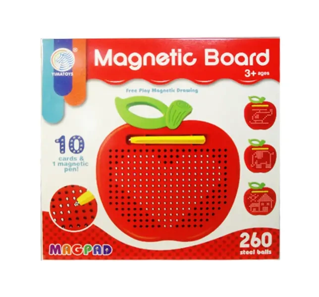 Magnetyczna mozaika do układania. Rozbudź wyobraźnię swoich dzieci i spraw, aby tworzyły unikalne obrazy. Tablica umożliwia dzieciom rozwijanie swoich umiejętności motorycznych przez układanie magnetycznych kołeczków w różne wzory i obrazy. W zestawie znajduje się deska magnetyczna w kształcie jabłka, kołeczki w różnych kolorach, długopis, 10 dwustronnych karteczek ze wzorami do układania. Zabawka dla dzieci od 3 lat. Zapakowana w kartonowe opakowanie. Podane wymiary są wymiarami opakowania.