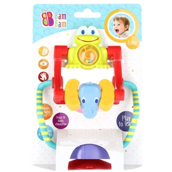 Karuzela na przyssawkę BAM BAM zabawka edukacyjna przeznaczona dla maluchów od 6m . Karuzela osadzona jest na obracającej się platformie. W wyniku obrotu platforma wydaje delikatne odgłosy, dźwięki, dzięki kolorowym kuleczkom umieszonym na pałąku karuzeli. Karuzela o zróżnicowanej fakturze i wzorach, kolorach grzechotek, które kręcąc się, absorbują uwagę dziecka aktywizując jego zmysły wzroku, dotyku, słuchu. Przyssawka osadzona pod zabawką zapewnia stabilne mocowanie do blatu stolika, tacki wózka czy krzeska do karmienia. Wymiary/waga/baterie wymiary produktu szer. x wys. cm 13x16 wymiary opakowania dł. x wys. x gł. cm 15x21x10, waga produktu bez opakowania kg 0,14 kg, waga produktu w opakowaniu kg 0,16 kg, nie wymaga zasilania bateriami. Zabawka przeznaczona dla dzieci w wieku 6m . Pakowana na blistrze.