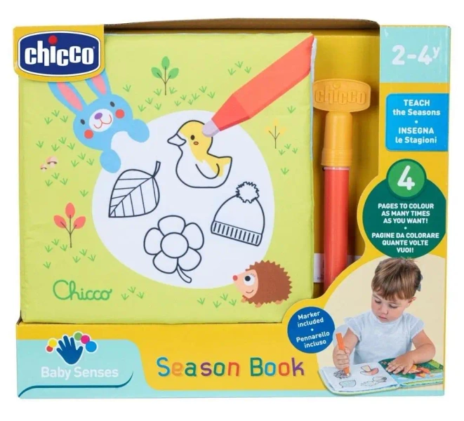 KSIĄŻECZKA 4 PORY ROKU to tekstylna kolorowanka z magicznym flamastrem wodnym wielokrotnego użytku, która uczy pór roku oraz ich cech charakterystycznych.