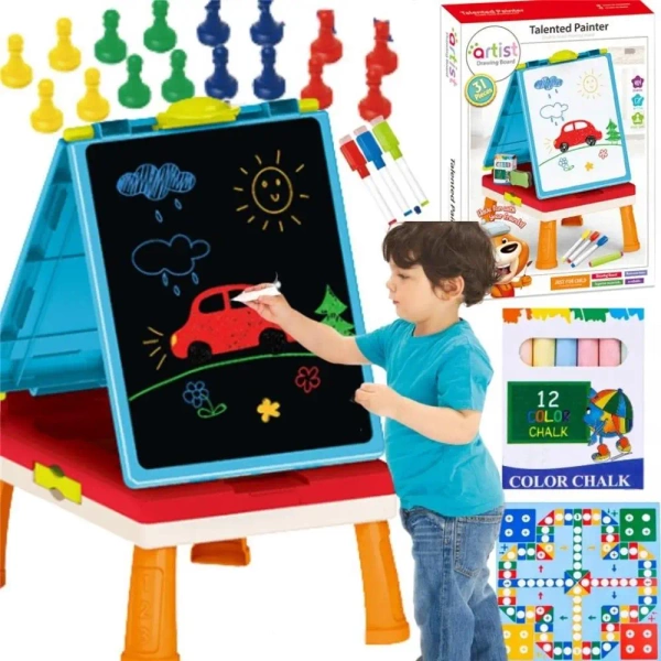ZESTAW do malowania 2w1 będzie idealną rozrywką dla przyszłego artysty! Dzięki niemu dziecko będzie mogło rozwinąć swoje zdolności artystyczne! Zestaw posiada tablicę dwustronną: kredową ( do pisania kredą ) oraz magnetyczną (do pisania markerami).Tablica została wyposażona w różne przybory małego artysty. Dzięki tym elementom, komplet nie sprawi żadnej trudności, a dziecko będąc na początku swojej przygody z malowaniem również będzie mógł się nauczyć rysować!