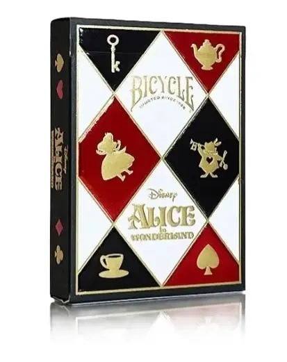 Zabierz swoje następne spotkanie przy kartach w dół króliczej nory z talią kart inspirowaną Alicją w Krainie Czarów od Bicycle! Pudełko bogato zdobioną czerwoną, czarną i złotą folią, emanuje wspaniałością godną królewskiego dworu Królowej Kier. Figury zaprojektowane na zamówienie ożywają dzięki ukochanym postaciom, takim jak Alicja, Szalony Kapelusznik i tajemniczy Kot z Cheshire!