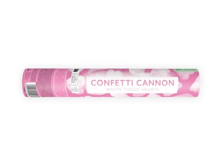 Tuba strzelająca bibułowymi sercami w kolorze białym, długość 28 centymetrów.