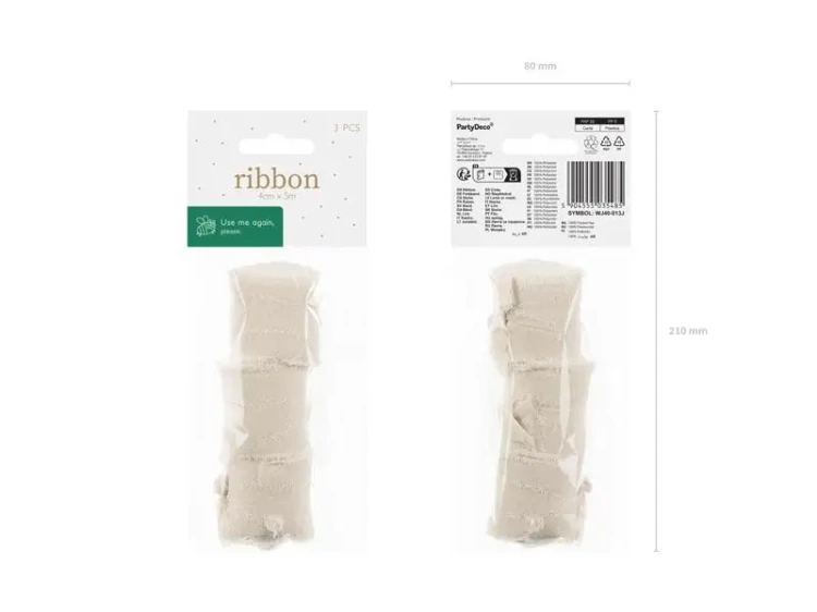 Wstążka szyfonowa w kolorze jasnobeżowym to elegancki dodatek, który znakomicie sprawdzi się przy różnorodnych projektach dekoracyjnych. Posiada szerokość około 40 mm i rozciąga się na długość mniej więcej 5 metrów. W opakowaniu znajdują się łącznie trzy sztuki tej ozdobnej wstążki.