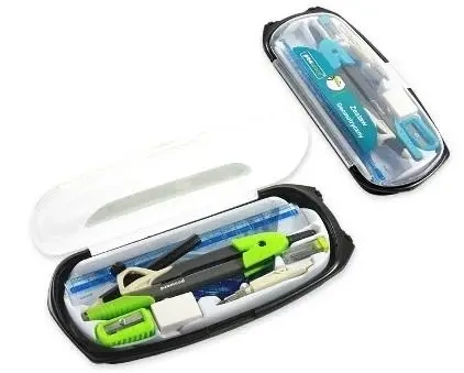 Przedstawiamy kompletny zestaw geometryczny, składający się z 10 starannie wybranych elementów, które są niezbędne w precyzyjnych pracach matematycznych i geometrycznych.