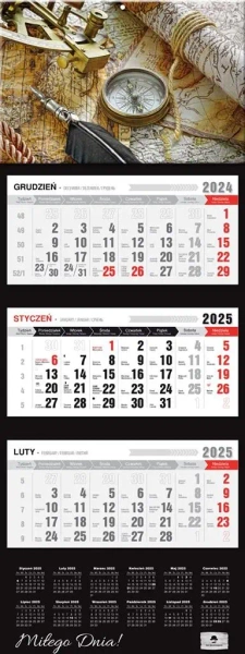 Odkryj wyjątkowy Kalendarz Trójdzielny PREMIUM z imponującą wypukłą główką. Jego format wynosi 315x810mm, co pozwala na wygodne użytkowanie i łatwe planowanie każdego dnia. Ten kalendarz oferuje trzy zestawy klasycznych kalendariów wyposażonych w przesuwną ramkę, dzięki której z łatwością zaznaczysz aktualny dzień.