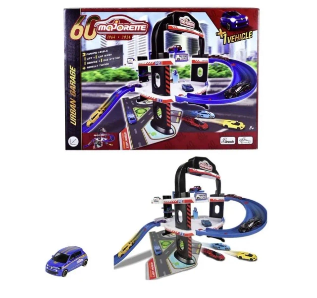 Trzypoziomowy garaż w specjalnej limitowanej edycji na 60-lecie marki Majorette. Wyposażony w ręczna windę, myjnię samochodową i stację benzynową. W zestawie auto na licencji marki Renault. Wymiary: 53,4x39x13,3 cm, 5l+