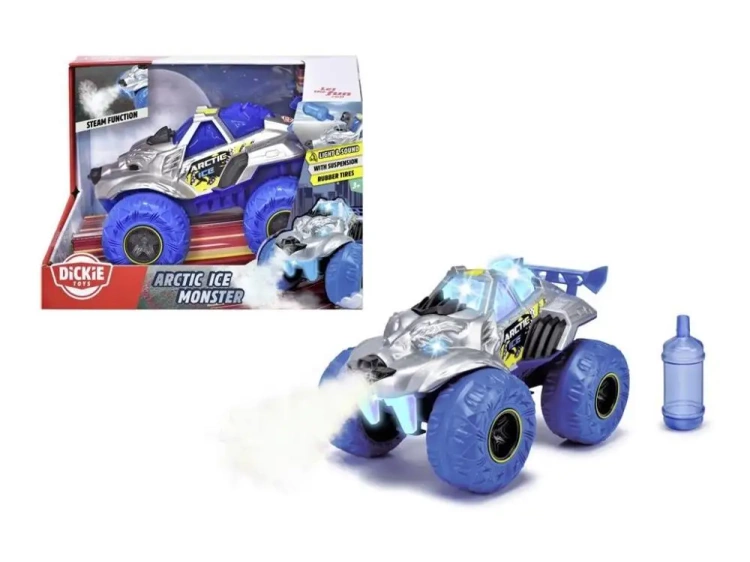 Pojazd Lodowy Potwór z wolnym kołem, funkcją światła i dźwięku, z pracującym zawieszeniem oraz gumowymi kołami. Dodatkowo posiada pojemnik na wodę, dzięki czemu wypuszcza parę wodną umieszczonym na masce otworem. Długość: 25 cm, 3l+