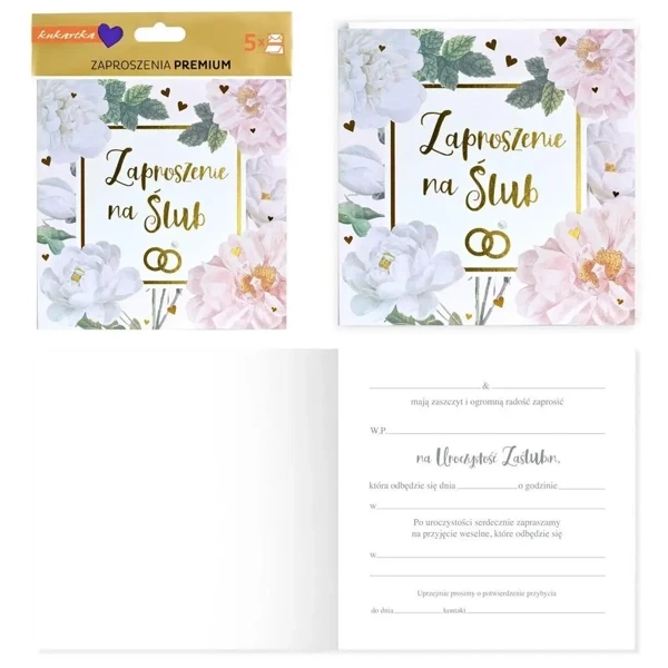 opakowanie: woreczek zawierający 5 sztuk zaproszeń z kopertami,