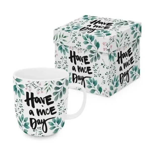 Kubek porcelanowy o pojemności 350 ml, przedstawiający stylizowany napis: Have a nice day. Wykonany z porcelany charakteryzującej się wyjątkową elegancją i wytrzymałością. Poręczne ucho gwarantuje stabilny uchwyt podczas picia. Zapakowany w ozdobne pudełko, o tym samym motywie. To doskonały pomysł na upominek dla najbliższych, przyjaciół i znajomych.