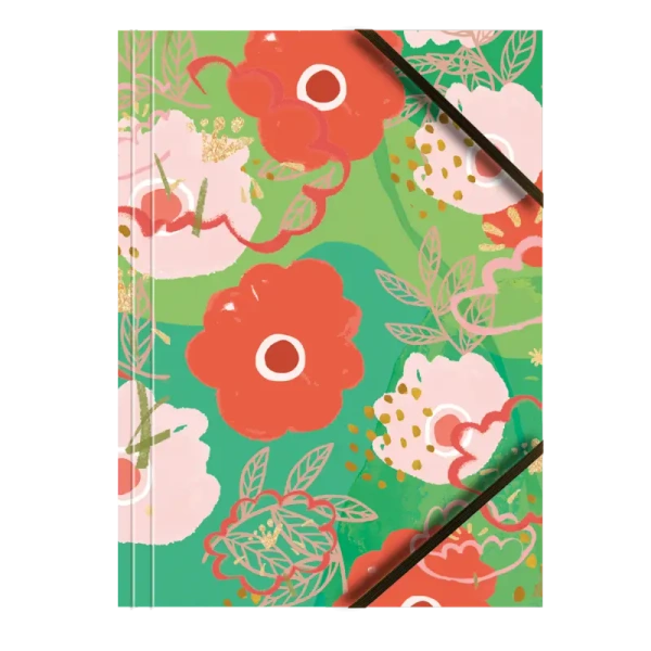 Poznaj teczkę kartonową ozdobioną urzekającą grafiką pastelowych kwiatów. To wyjątkowe akcesorium wyposażono w gumkę narożną, dzięki której wszystkie dokumenty w formacie A4 będą bezpiecznie przechowywane. Powierzchnia teczki jest lakierowana, co nadaje jej elegancki połysk oraz dodatkową ochronę.Praktyczne Wymiary