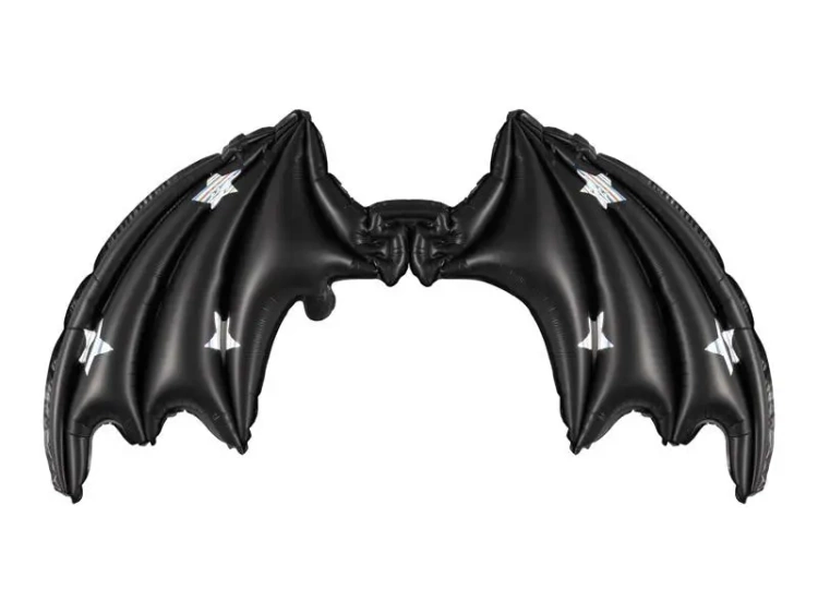 Balon foliowy w kształcie skrzydeł nietoperza, ze sznurkami do przywiązania do pleców, kolor czarny matowy z holograficznymi gwiazdkami, wym. ok. 85 x 50 cm. Do napompowania powietrzem. Zestaw zawiera słomkę.