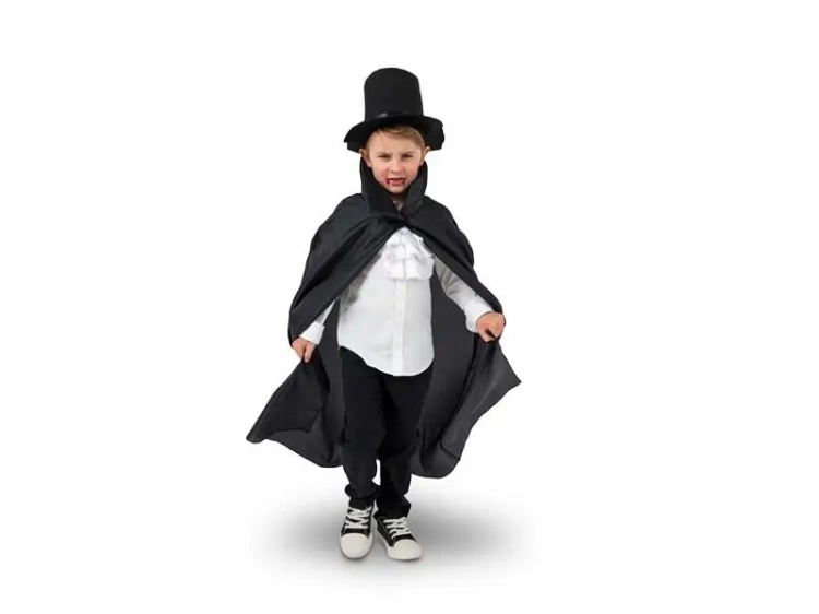 Strój dziecięcy Dracula w kolorze czarno-białym, rozmiar 116-128. Zestaw zawiera pelerynę, żabot i czapkę. Skład: poliester - 95%, filc - 5%. Sposób konserwacji: prać ręcznie.