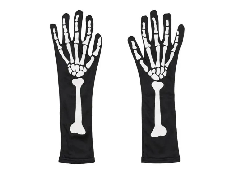 Rękawice świecące w ciemności, w kolorze czarnym z motywem ręki kościotrupa o rozmiarze S/M, długość ok. 39.5 cm, obwód ok. 30 cm. Skład: poliester - 100%. Sposób konserwacji: prać ręcznie.