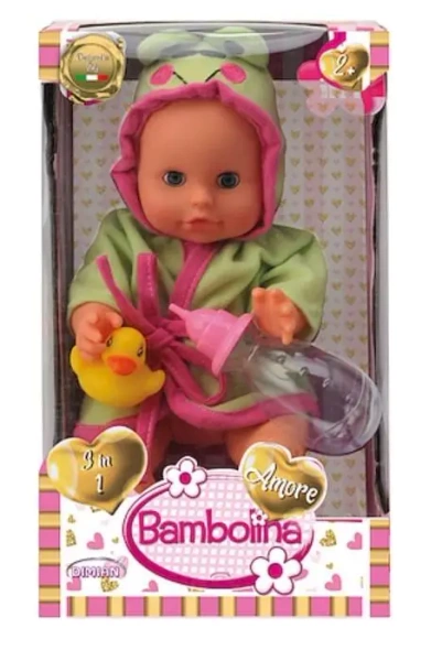 Lala wykonana jest z miękkiego plastiku. Jest ubrana w śliczny zielony szlafrok. Można ją zabrać do kąpieli. Lalkę można napoić wodą, wtedy będzie siusiać.
