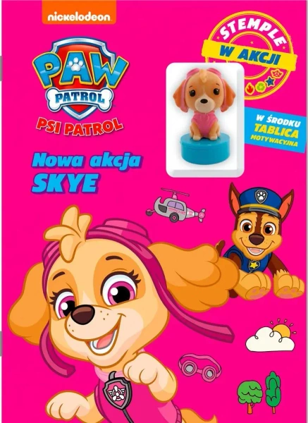 Psi Patrol. Stemple w akcji to fantastyczna książka dla każdego fana dzielnych piesków. W środku na malucha czekają zagadki, kolorowanki, zadania logiczne i łamigłówki, w rozwiązywaniu których pomocny będzie dołączony do książki stempel z nieustraszoną Skye. Publikacja pobudza wyobraźnię, spostrzegawczość i umiejętność analizy. Książka stanowi wspaniałą propozycję na kreatywne spędzenie czasu w towarzystwie ulubionych bohaterów. Świetna zabawa gwarantowana!