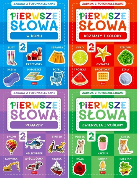 Seria książeczek „Pierwsze słowa” jest przeznaczona dla dzieci i rodziców do wspólnego oglądania, czytania i rozwiązywania prostych zagadek. Kolorowe ilustracje w postaci zdjęć (a nie rysunków) sprawiają, że dzieci łatwiej rozpoznają znajome przedmioty, odkrywając świat wokół siebie i ucząc się nowych słów. Liczne naklejki umilają zabawę i wspierają rozwój manualny malucha. Książeczki przeznaczone są dla dzieci w wieku 2+.
