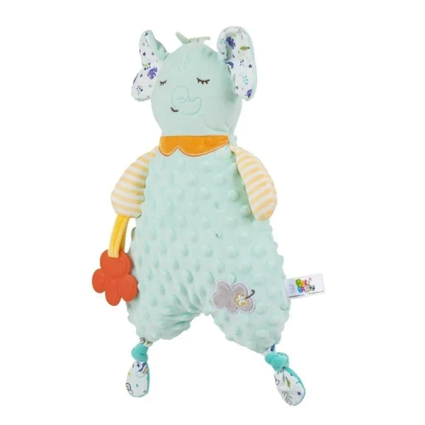 Milusi zwierzaczek prosi o mocnego przytulasa! Zabawka uszyta została z materiałów różniących się kolorem, wzorem i fakturą, dzięki czemu stymulować będzie zmysły maluszka, pomagając mu tym samym w rozwijaniu zdolności poznawczych. Śpioszka zdobi haft w kształcie chmurki, para uroczych supełków oraz doczepiony do łapki gryzak z wypustkami, który z pewności przyda się dzidziusiowi podczas ząbkowania. Spłaszczona, mięciutka forma czyni ze słonika wymarzoną przytulankę.
