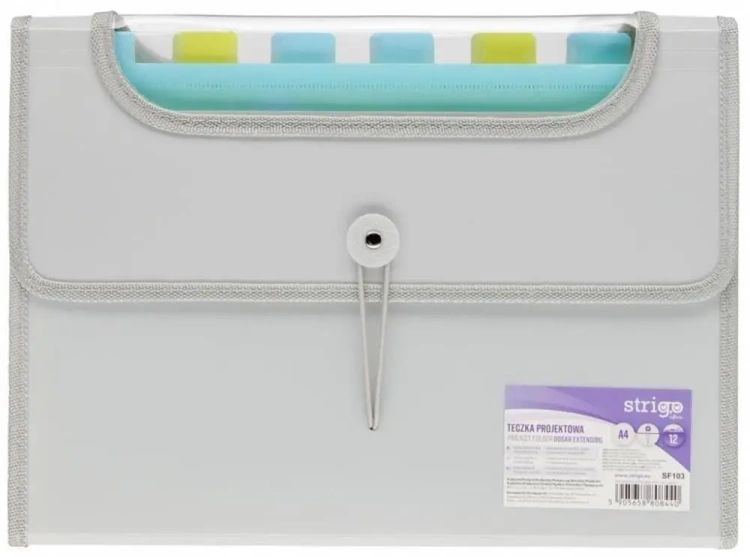 Wnętrze teczki wyposażone jest w 12 kolorowych przekładek, które pomagają utrzymać porządek w dokumentach i ułatwiają ich segregację.