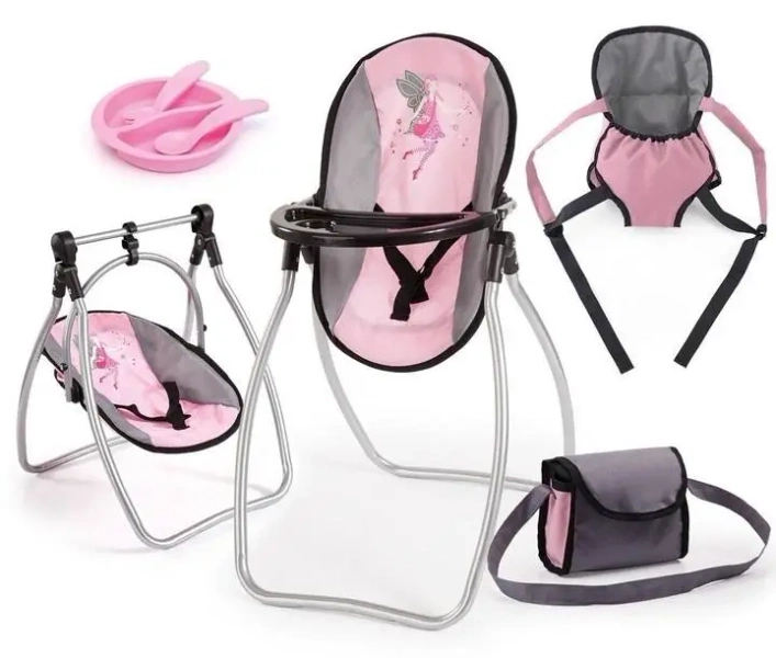 Zestaw Vario dla lalek daje wiele możliwości, aby zaopiekować się swoim małym ulubieńcem i poczuć się jak prawdziwa mama. Zestaw ten zawiera wszystko, co jest potrzebne: torba, nosidełko dla lalek wykonane z tkaniny, plastikowa zastawa stołowa a także wielofunkcyjne siedzisko, które może być używane jako huśtawka, solidny wózek dla lalek czy jako krzesełko z taca. Ponadto lalka może być bezpiecznie zamocowana za pomocą zintegrowanego paska. Nadaje się dla lalek o długości do 38 cm. Dostawa (bez lalki) w pięknym pudelku pokazowym. Wymiary (cm): 41 x 28 x 5