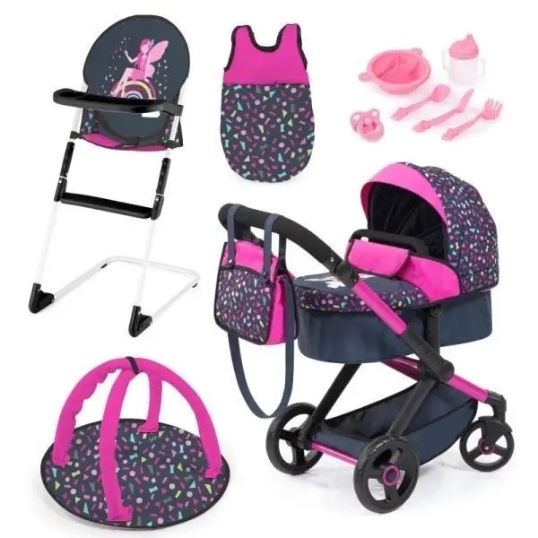 Ten duży zestaw dla lalek składa się z wózka dla lalek, wysokiego krzesełka, śpiworka, koc do zabawy i plastikowych akcesoriów. Nowoczesny wózek dla lalek combi XEO ma elegancki wygląd i wiele różnych funkcji, odpowiedni dla lalek o wielkości do 46 cm. Dzięki regulowanej rączce wózek ten można łatwo dostosować do wzrostu dziecka; możliwe jest również umieszczenie walizki w obu kierunkach. Ponadto XEO ma odwracalny uchwyt, dzięki czemu można go łatwo przesuwać w obie strony. Dzięki dołączonym zatrzaskom i możliwej zmianie kata przenośnego łóżeczka wózek dla lalek można w kilka sekund zamienić na wózek spacerowy. Obracane przednie kola gwarantują stabilne pokonywanie zakrętów. Zestaw zawiera również śpiworek do usypiania lalki.