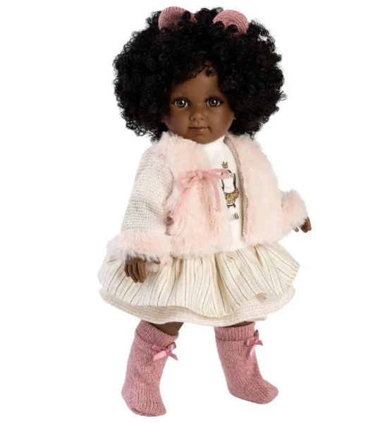 W naszej manufakturze wierzymy, że zabawa jest najlepszą nauką. Dlatego też z wielką miłością tworzymy kultowe lalki Llorens, w 100% ręcznie wykonane, o niepowtarzalnych wzorach. Stosowane przez nas tkaniny pochodzą od renomowanych marek odzieży dziecięcej. Wszystkie lalki Llorens są zgodne z europejskimi przepisami dotyczącymi bezpieczeństwa dzieci, co gwarantuje, że Twoje dzieci będą się bawić w możliwie najbezpieczniejszy sposób. Lalka Zuri 35 cm jest to piękna ciemnoskóra dziewczynka, która posiada bujne, kręcone, czarne włosy i brązowe oczy. Cała stylizacja lalki jest bardzo modna i dziewczęca. Ubranka uszyto z przyjemnych w dotyku tkanin by zapewnić dziecku wysoki komfort zabawy. Zuri jest ubrana w sukienkę z łączonych materiałów, futrzana kurteczkę oraz długie skarpetki z kokardkami. Dopełnianiem stylizacji jest śliczna opaska. Jej rączki, nóżki i główka zostały wykonane z przyjemnego w dotyku winylu a brzuszek z materiału, wypełniony miękką wyściółką. Lalka została zapakowana w ozdobny karton. Kochamy hiszpańskie lalki Llorens!