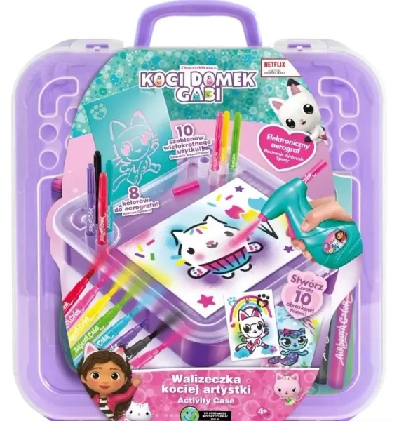 Walizeczka kociej artystki z linii Koci Domek Gabi to wspaniały pomysł dla każdej małej artystki. Walizeczka jest poręczna i wygodna. Zawiera wszystko, co jest potrzebne do kreowania wspaniałych projektów za pomocą aerografu: markery, szablony, naklejki.