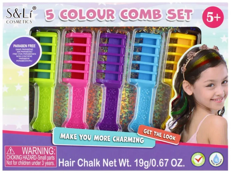 Zestaw zawiera 5 grzebieni koloryzujących włosy, grzebień w kolorze różowym, zielonym, fioletowym, niebieskim, żółtym.