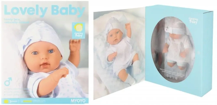 Zawartość zestawu: lalka bobas 30 cm, podusia kocyk.
