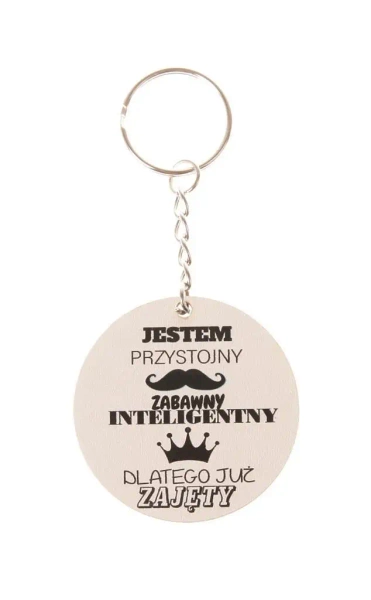 Breloczek z zabawną grafiką to nie tylko ciekawy pomysł na upominek, ale niezwykle funkcjonalny element, który można przyczepić do kluczy czy szkolnego plecaka. Drobny, miły prezent dla młodego mężczyzny nie tylko na Dzień Chłopaka, bowiem napis Jestem przystojny, zabawny, inteligentny, dlatego już zajęty czyni ten upominek uniwersalnym na różne okazje. Wykonany został z płyty MDF i ozdobiony jest piękną, kolorową grafiką, która nadaje mu wyjątkowego uroku. Nadruk jest wysokiej jakości, co czyni go trwałym w użytkowaniu. Wymiary całkowite ok. 10cm x 5cm. Brelok zapakowany w woreczek z eurozawieszką wraz z kodem EAN.